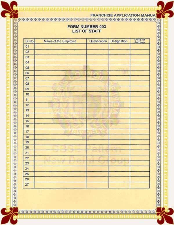This is a mandate form. In case of existing schools, the complete list of teaching and non-teaching staffs should be attached with franchise application form. The fresh applicants will have to produce it before the secondary-level-verification. The name , qualification, designation column should be filled in block letters only. The applicant organizations should follow the qualification-eligibility criteria of the state government and appoint staffs at their own responsibility and affordability. Additional sheets may be attached to provide complete list of staffs.
